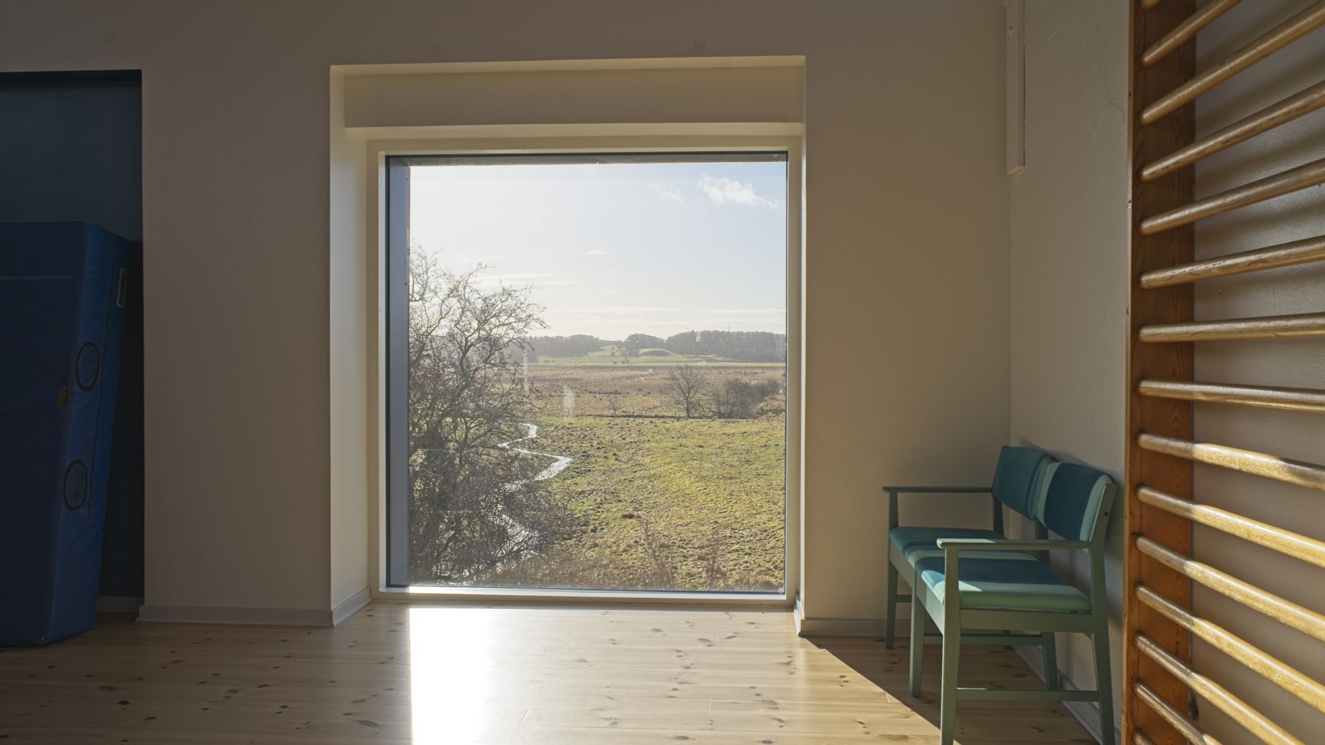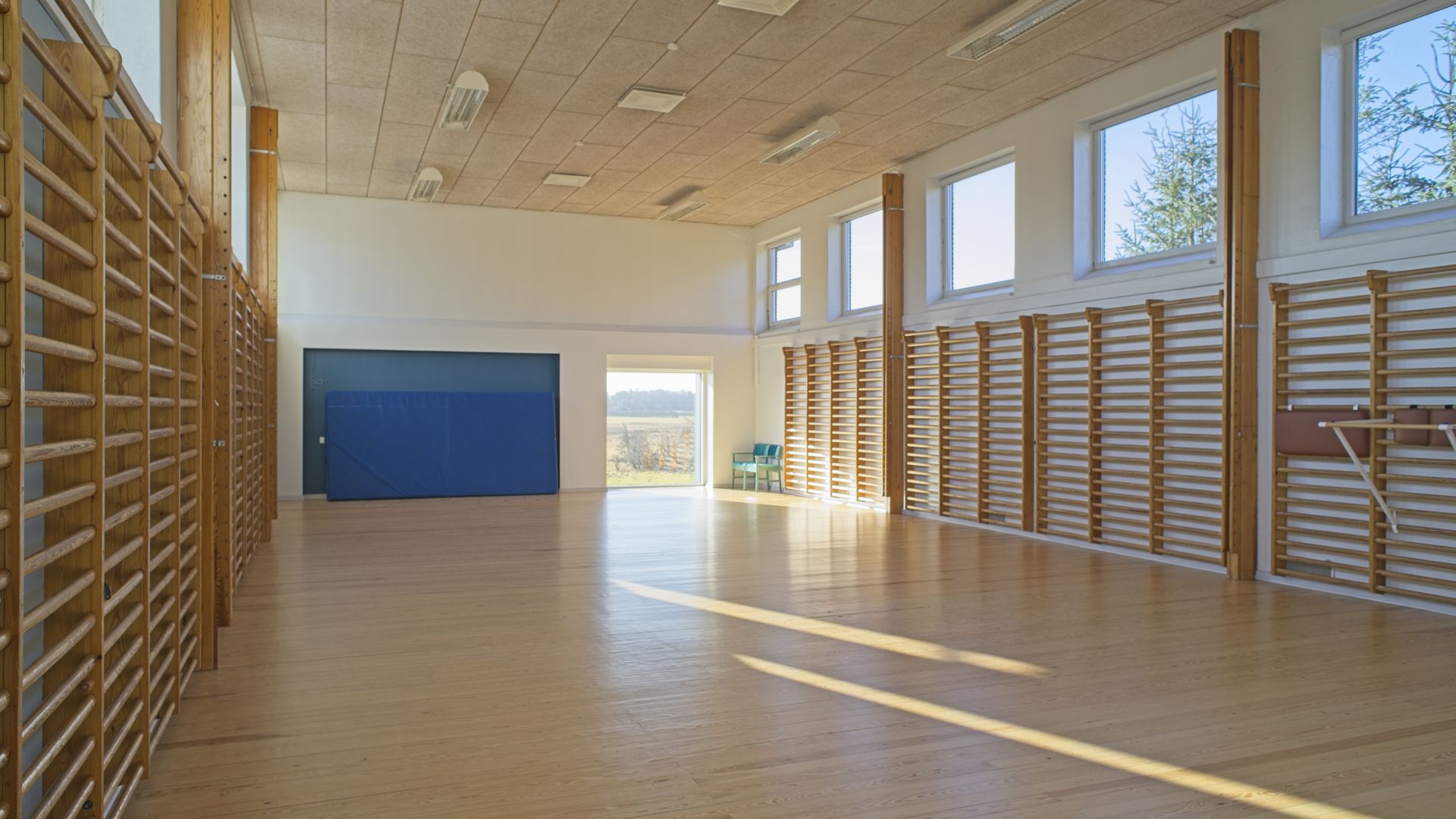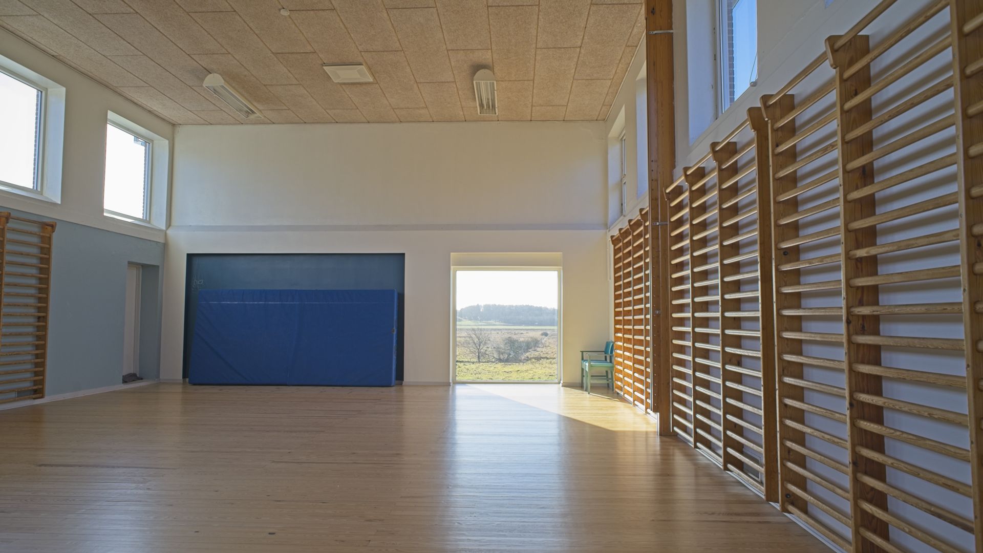 Vores gymnastiksal er en klassisk en af slagsen med ribber langs væggene. I enden er et stort panoramavindue med udsigt over Simested ådal.
