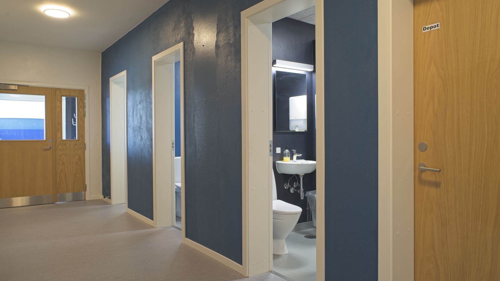 I gangen mellem hall og gymnastiksal findes 3 toiletter med hver sin brusekabine.