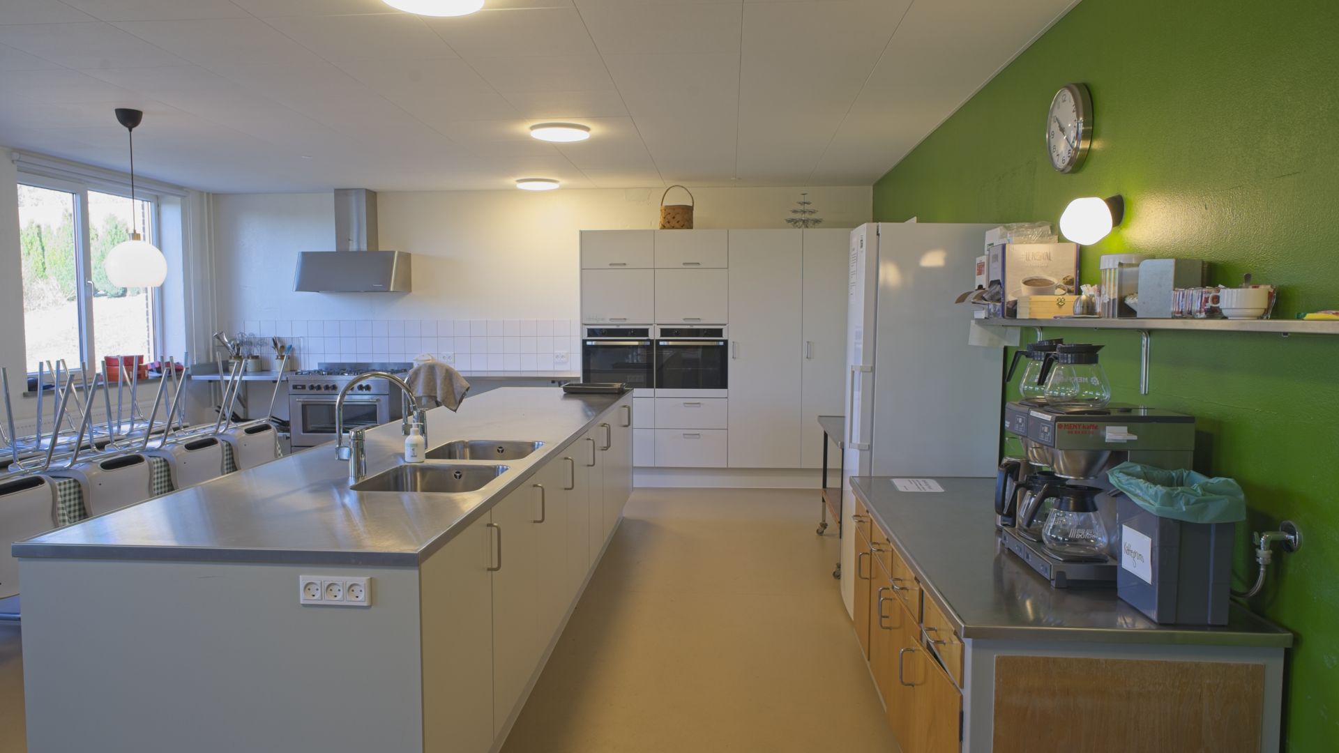 Køkkenet er meget veludrustet med stort gaskomfur, 3 ovne, industriopvasker, stor dobbel kaffemaskine,