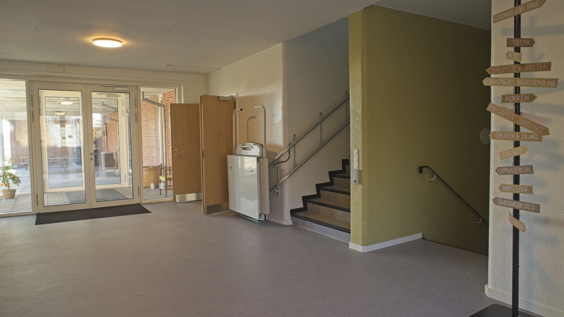 Huset er handicapvenligt, med automatisk døråbning, stort handicaptoilet og kørestolslift til 1. sal.